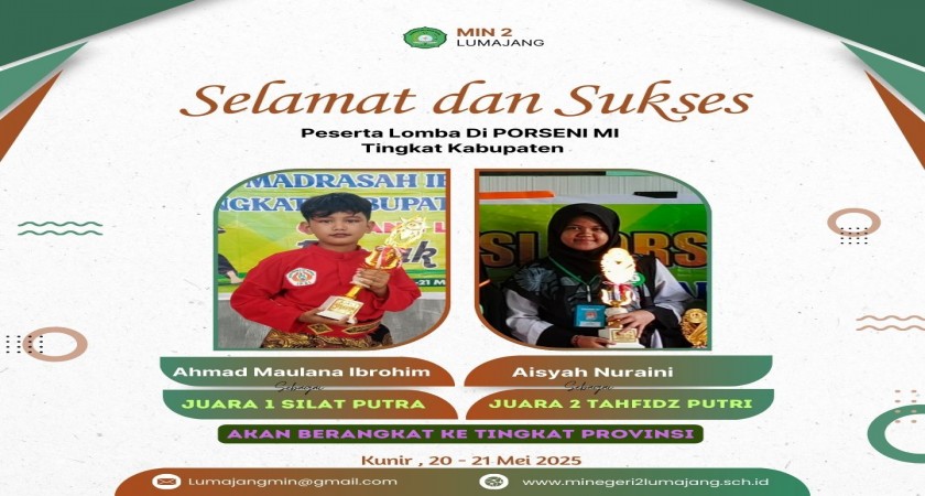 Sabtu, 26 April 2025 I Selamat kepada Andini Juara 2 dan Putri Juara 2 (TK usia Dini) Siswa MIN 2 Lumajang di ajang Lumajang Championsip 2 Piala KEMENPORA RI NASIONAL di Gor Wiira Bhakt